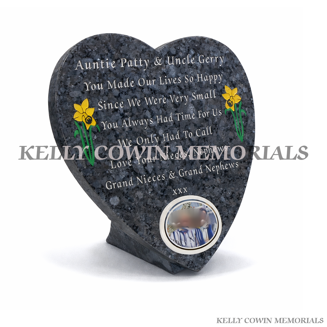 Our Blue Pearl granite 12 inch heart shaped memorial plaque with ceramic photo is a timeless and elegant tribute, handcrafted with care by Kelly Cowin Memorials. Made from premium Blue Pearl granite, this plaque offers a beautiful natural sparkle and exceptional durability, suitable for all Irish weather conditions.