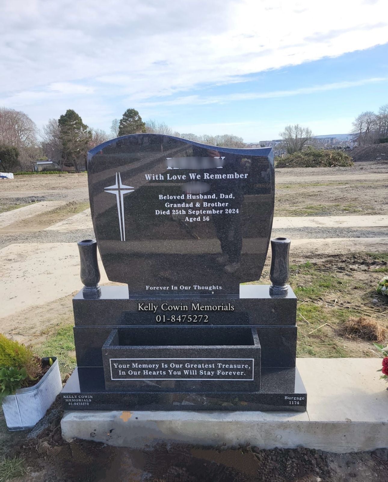(Please note that Kelly Cowin Memorials may add vat as required by law to any extra payments they pay to any third party at the customer’s request)